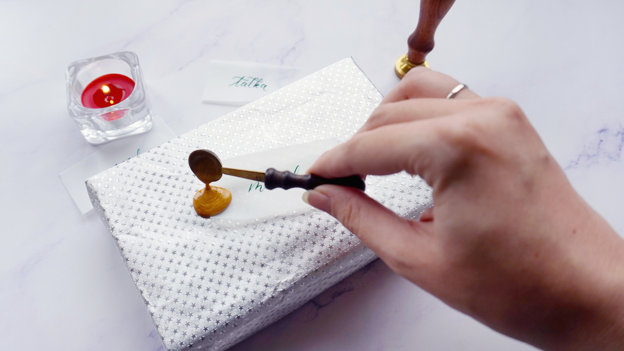 6. Pečeť s pauzovacím papírem | Zlatou nebo jinou vánoční pečetí připevněný něžný průsvitný pauzák působí opravdu ladně a proto bych ho používala zejména u dárků určených ženskému pohlaví. Pauzovací papír lze popsat jakýmkoli popisovačem, který se nerozmazává, ale nejlépe inkoustem a perkem. Pokud zvládáte základy, kaligrafický nápis nejlépe doplní tento elegantní styl jmenovky.