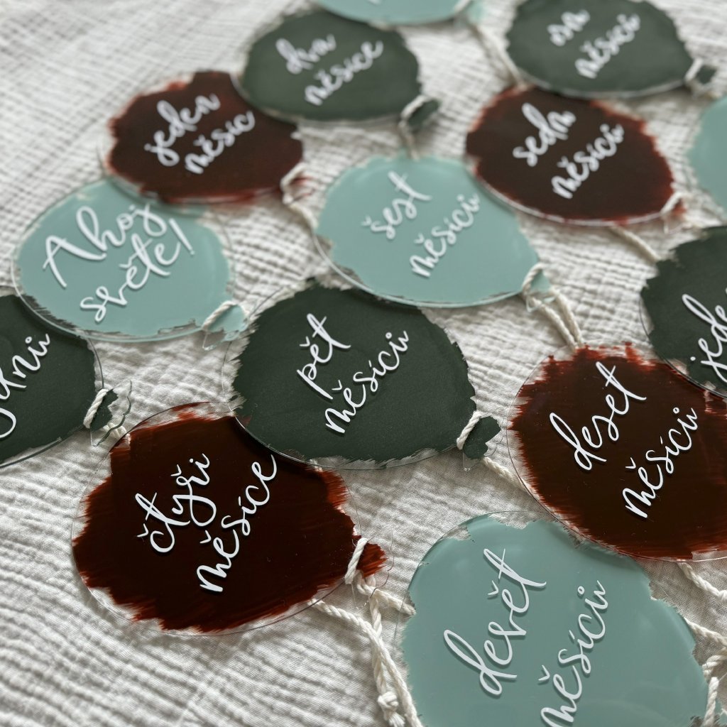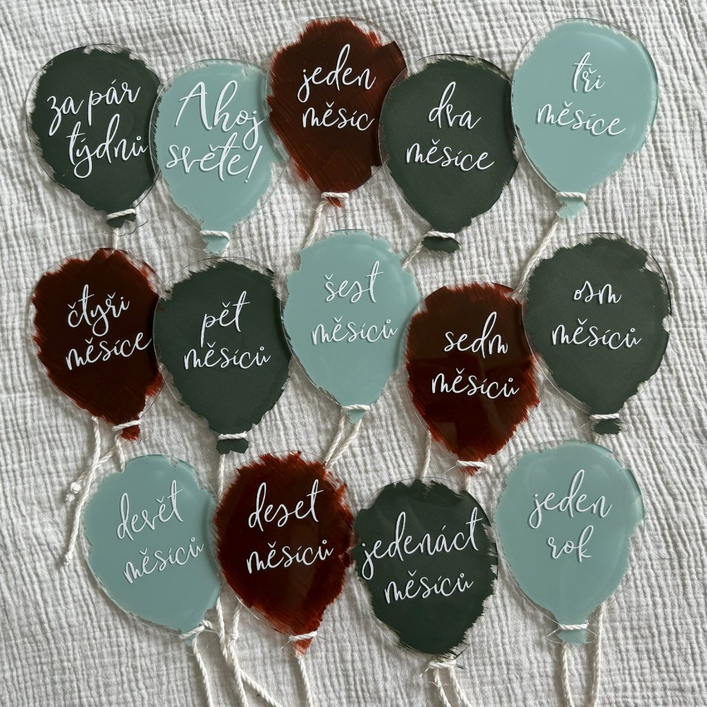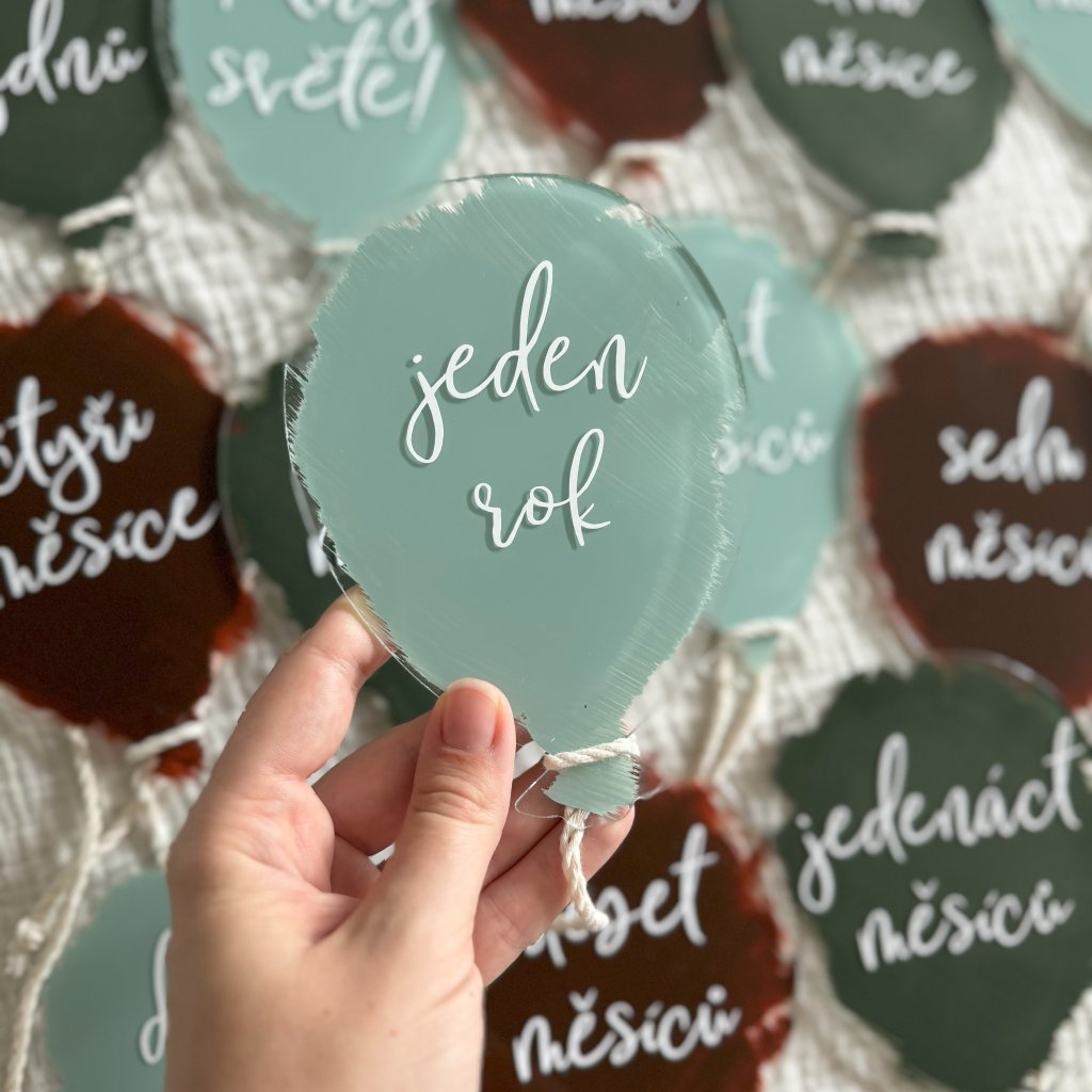 Luxusní a moderně vyhlížející kaligrafií ručně popsané sklíčka tvaru balónku z akrylu/plexi sloužící jako milníkové kartičky pro photoshoot s miminkem a zaznamenávání růstu v průběhu jednoho roku. Plexi je podmalováno Vámi zvoleným odstínem barvy. Pro podmalování je použita akrylová barva. Text je ručně digitálně napsán, následně vyříznut ze samolepící folie a nanesen na sklíčko.