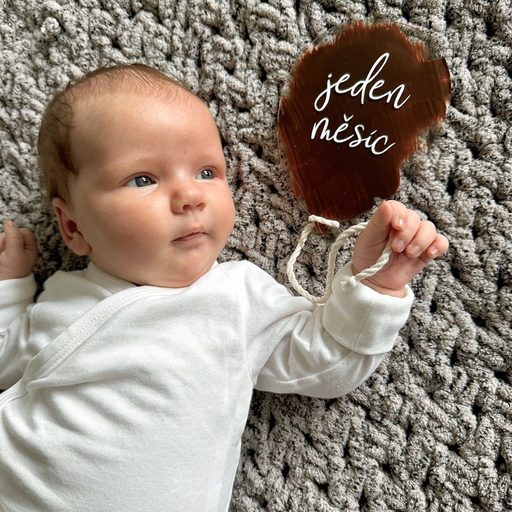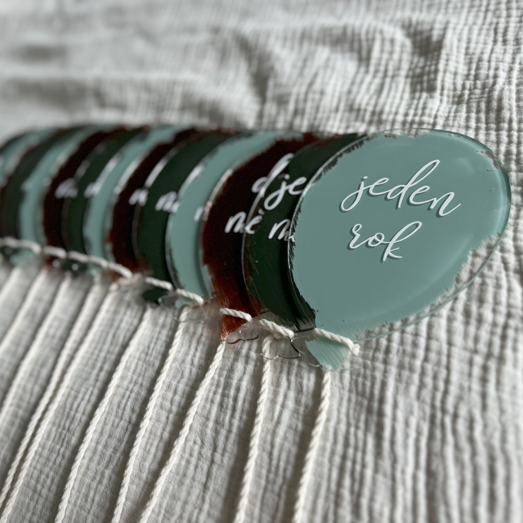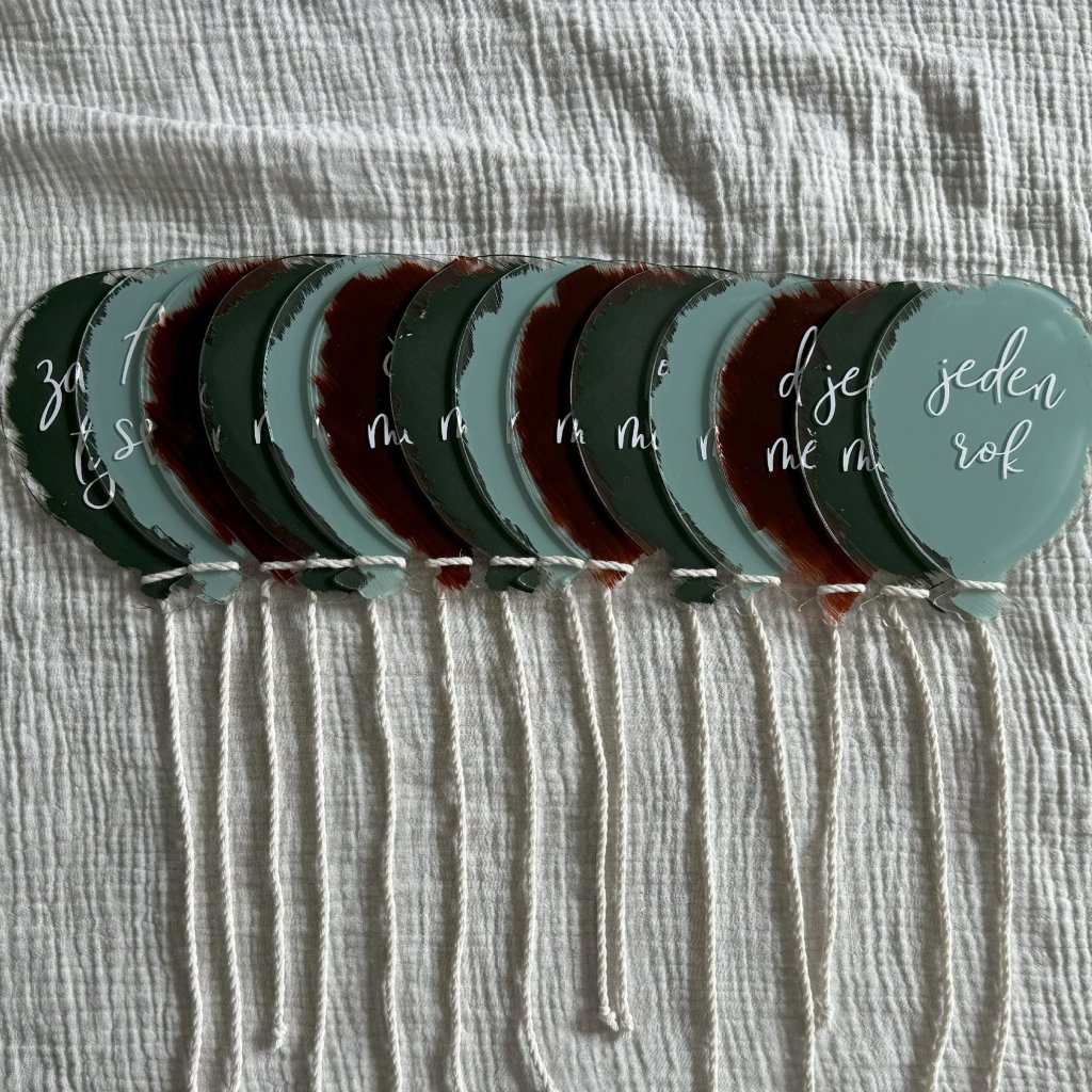 Luxusní a moderně vyhlížející kaligrafií ručně popsané sklíčka tvaru balónku z akrylu/plexi sloužící jako milníkové kartičky pro photoshoot s miminkem a zaznamenávání růstu v průběhu jednoho roku. Plexi je podmalováno Vámi zvoleným odstínem barvy. Pro podmalování je použita akrylová barva. Text je ručně digitálně napsán, následně vyříznut ze samolepící folie a nanesen na sklíčko.